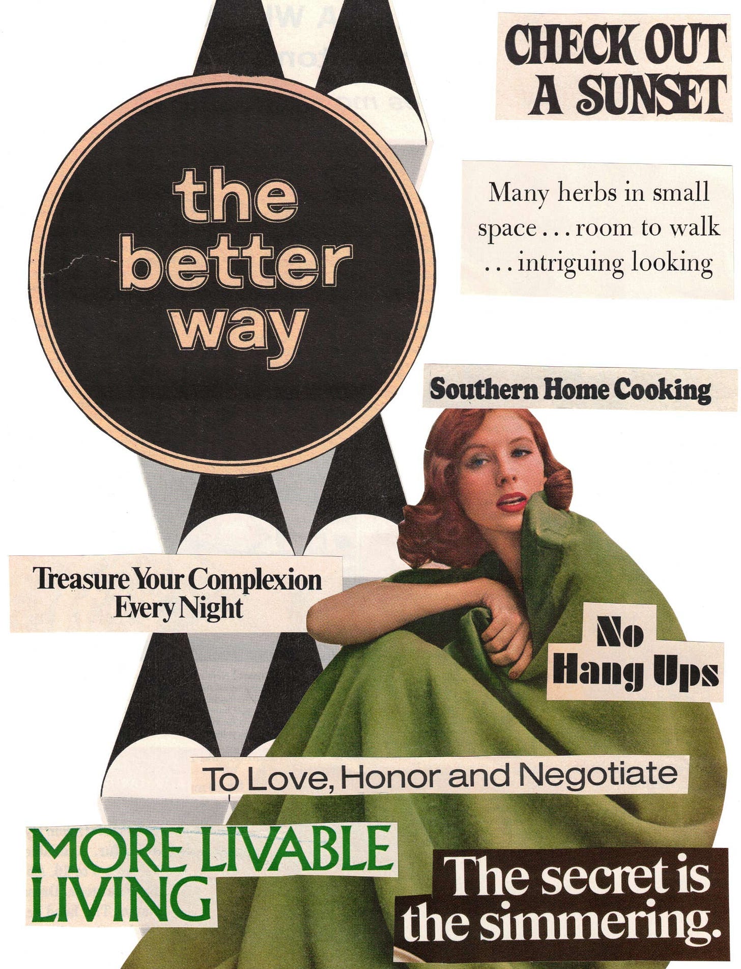 Collages are a found art form - the end result is dependent on the materials you begin with. As #10 of my list says, limitations beget creativity, and in flipping through my collection of tattered vintage magazines (anyone wondering why I had these prior to my collaging hobby may contact my lawyer for a reply) I found myself discovering how my priorities have shifted in the last year. I found it similar to tarot-reading - creating a narrative out of what chance places in front of you. You have to embrace imperfection - the magazines tear so easily, and it’s impossible to cut them completely straight - and the final product comes about through perusal, luck, and patience rather than effort.